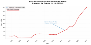 O mercado de energia reagiu instantaneamente aos primeiros bombardeios. O preço do barril de Brent, referência global, saltou de US72,48 no dia 27 de fevereiro para US 105,28 neste domingo (08 de março) — uma valorização de 48,8% em apenas sete dias úteis.
