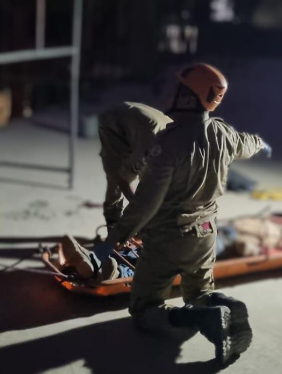 Bombeiros fazem resgate do corpo de vítima que caiu de andaime em prédio em construção