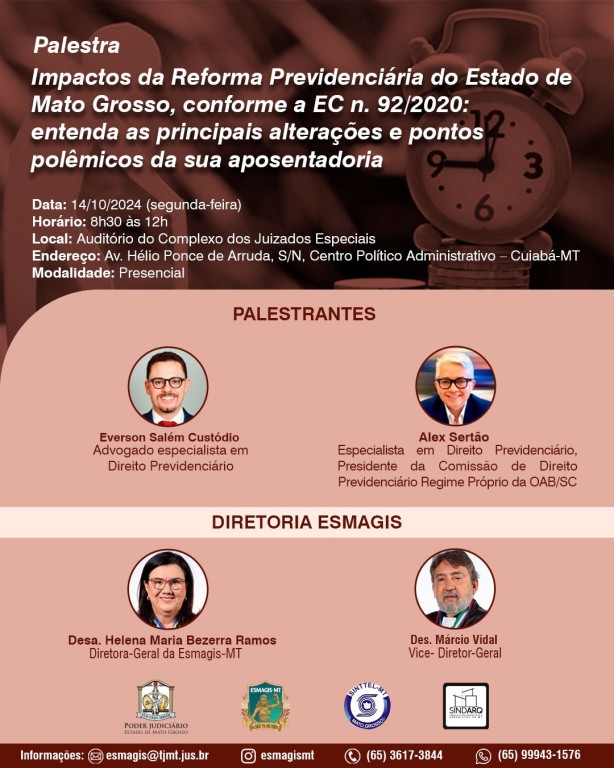 A Escola Superior da Magistratura de Mato Grosso (Esmagis-MT) ofertará, no próximo 14 de outubro, a palestra “Jornada de Atualização de Direito Previdenciário no Regime