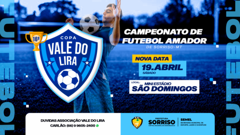 Devido as chuvas recorrentes, o início da 18ª edição da Copa Vale do Lira foi adiado para o sábado (19), com dois jogos a partir das 17h30, no Estádio Municipal São Domingos. A competição, que já faz parte do calendário esportivo do município, é promovida pela Associação Vale do Lira, com o apoio da Prefeitura de Sorriso.