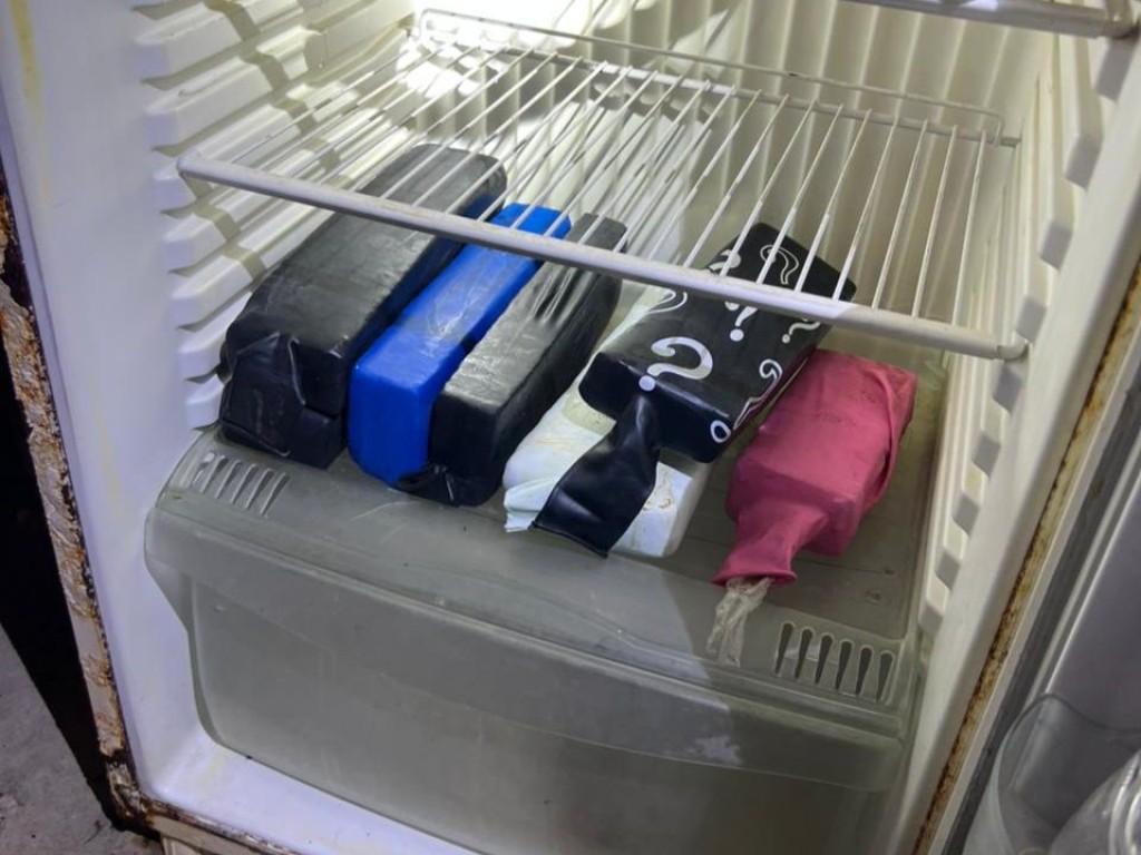 Em continuidade das diligências, a equipe realizou buscas nas proximidades e no interior da chácara, onde encontraram uma quantidade de sete tabletes de maconha dentro de uma geladeira, além de materiais para preparo do entorpecente como balança de precisão, rolo de plástico filme e uma faca.