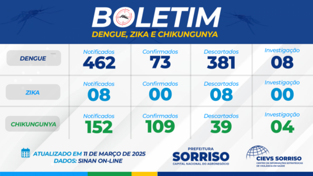No comparativo, em janeiro de 2024 foram 19 casos de dengue e em fevereiro, 80; no período (01/2024) também houve um registro de zika em janeiro e dois casos de chikungunya, sendo um em janeiro e outro em fevereiro.