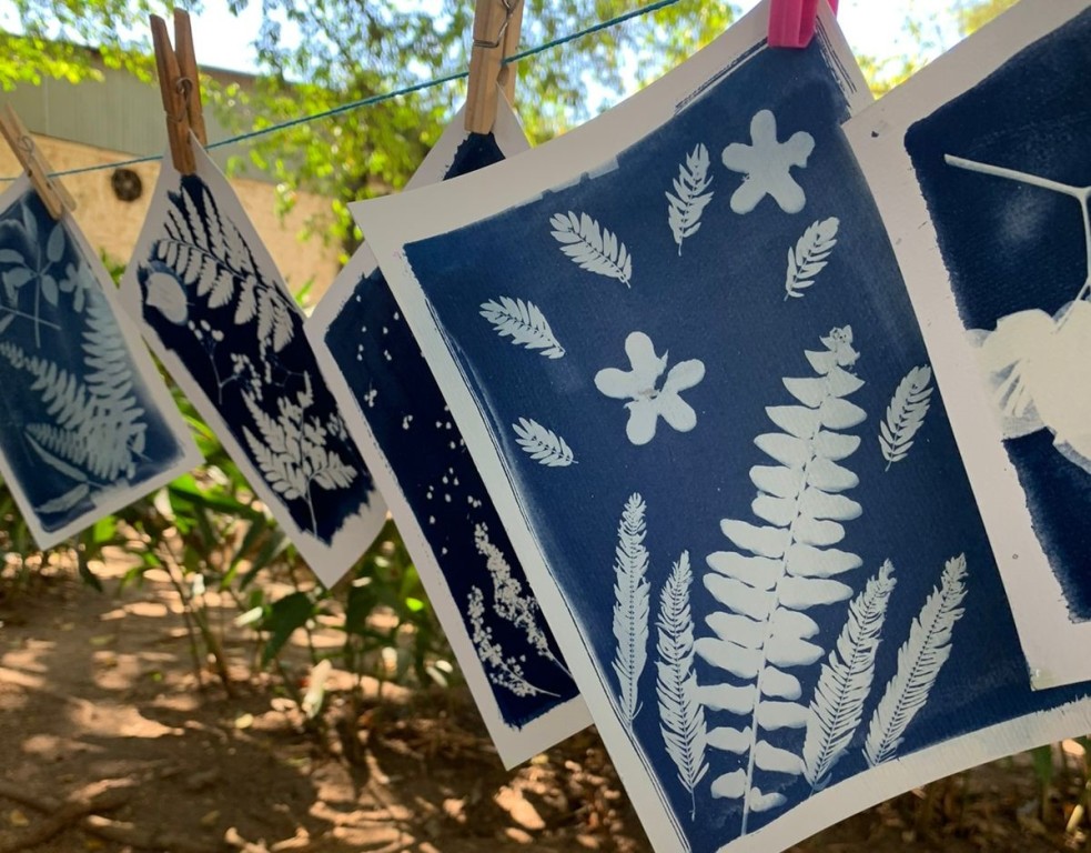 A atividade explora processos fotográficos naturais com o uso de sais de ferro e luz solar para criar imagens em tons de azul.