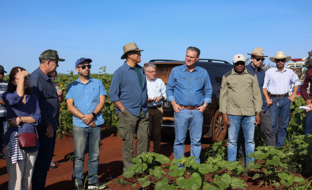 O ministro da Agricultura e Pecuária, Carlos Fávaro, a embaixadora do Brasil em Angola, Eugênia Barthelmess, e o secretário de Estado de Agricultura e Pecuária de Angola, Castro Paulino Camarada, lideraram a delegação brasileira nas visitas técnicas às fazendas Terras de Koló e Pungo Andongo nesta quarta-feira (7).
