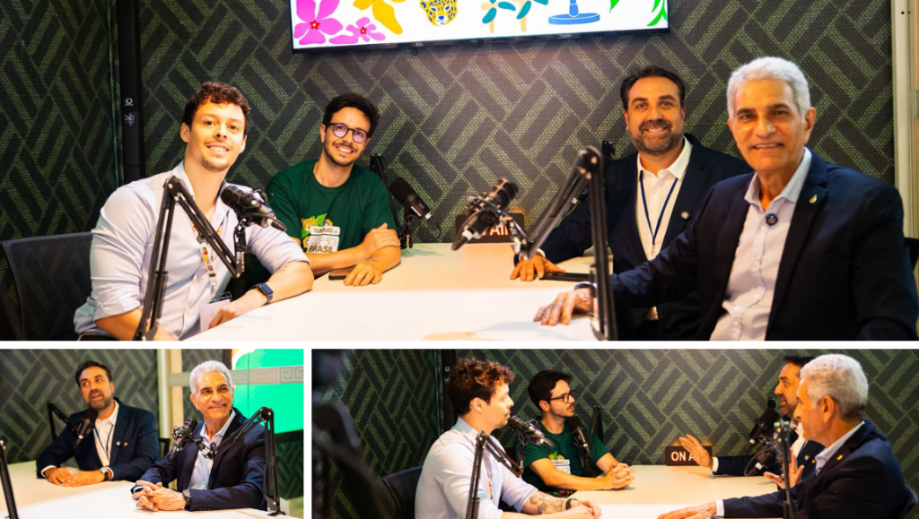 Dentro do estande “Conheça o Brasil”, localizado na Green Zone da COP30, o Ministério do Turismo conta com um estúdio dedicado às gravações e transmissões ao vivo do “Vídeo Cast – Diálogos da COP”.