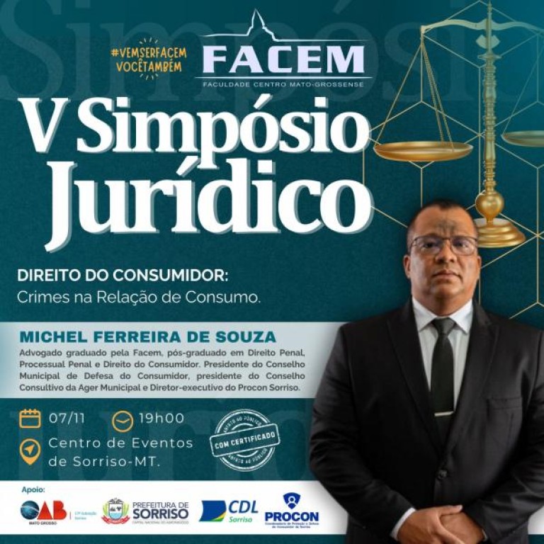 O diretor-administrativo do Procon de Sorriso, Michel Ferreira de Souza, será um dos palestrantes do V Simpósio Jurídico, promovido pela Faculdade Centro Mato-grossense (Facem), com apoio da Prefeitura de Sorriso, Ordem dos Advogados do Brasil (OAB), da Câmara de Dirigentes Lojistas (CDL) e do próprio Procon.