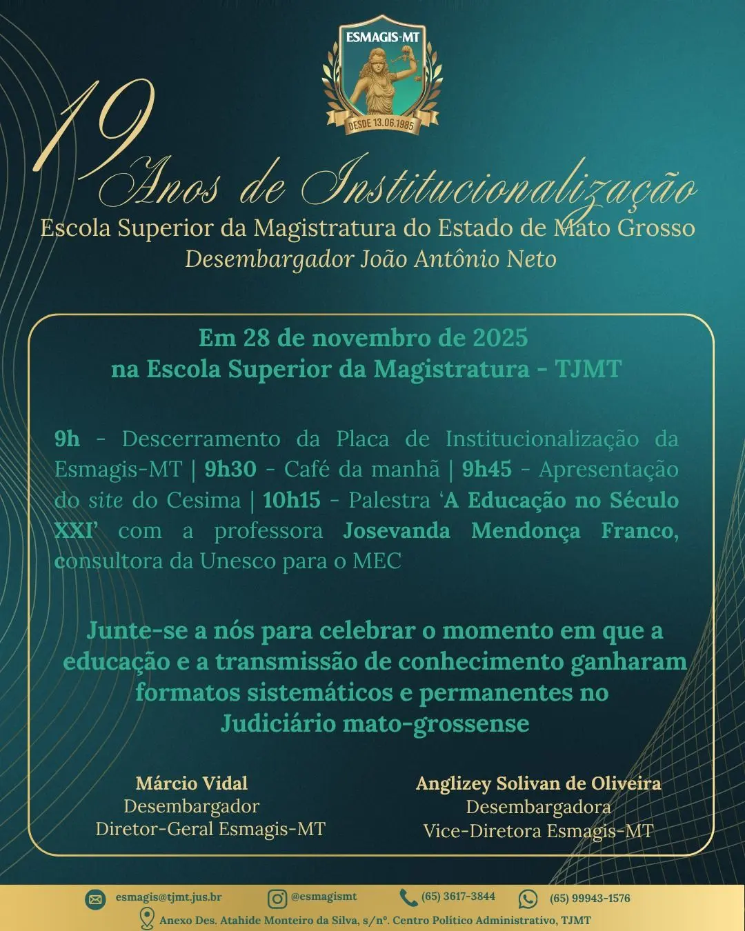 Na próxima sexta-feira (28 de novembro), a partir das 9h, a Escola Superior da Magistratura de Mato Grosso Desembargador João Antônio Neto (Esmagis-MT) promoverá um evento comemorativo pelos 19 anos de sua institucionalização. A iniciativa é organizada pela atual diretoria, composta pelo desembargador Márcio Vidal (diretor-geral) e pela desembargadora Anglizey Solivan de Oliveira (vice-diretora).