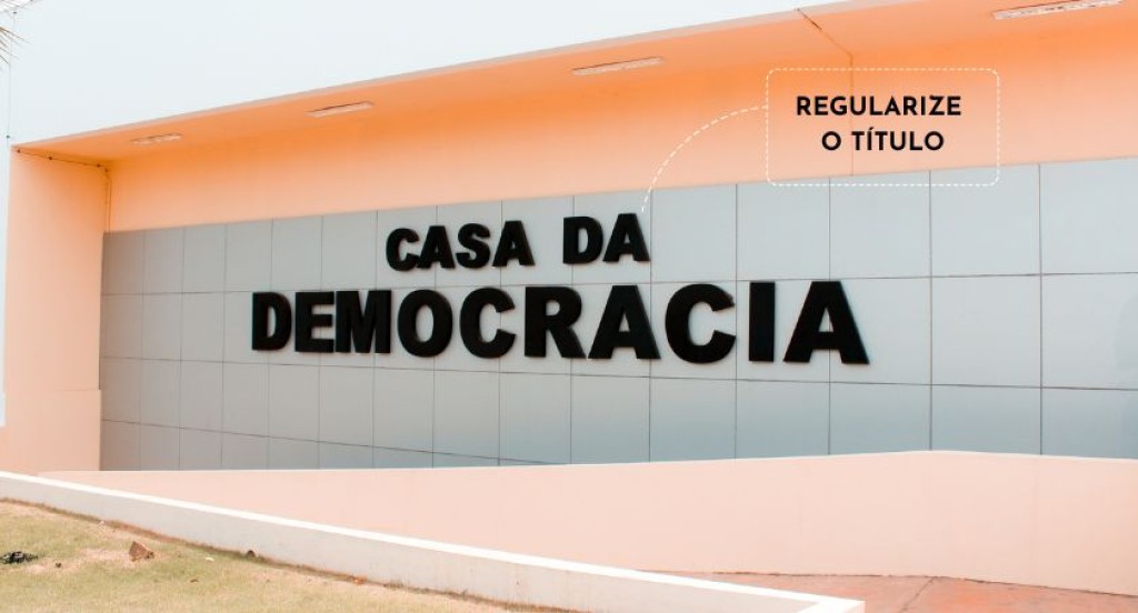 #PraTodosVerem: Imagem que mostra a fachada da Casa da Democracia, um prédio com detalhes nas cores branca e laranjada, com a identificação escrita na frente. No canto superior direito, está escrito, dentro de uma caixa de diálogo pontilhada, o texto “REGULARIZE O TÍTULO”.