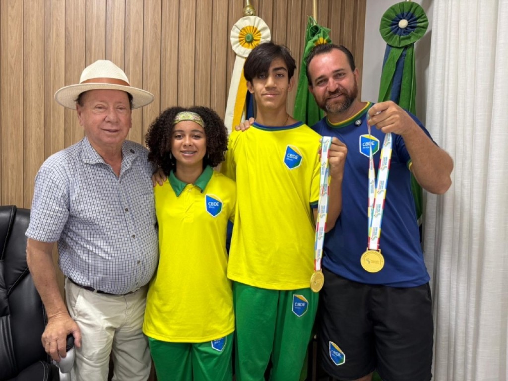 O prefeito Roberto Dorner recebeu, nesta quinta-feira (10), os atletas Miguel Moreira Barbosa Gomes e Wislainy Moraes Sousa, que retornaram dos Jogos Escolares Sul-Americanos trazendo medalhas, conquistas pessoais e a experiência de representar Sinop em uma competição internacional. O encontro, marcado por leveza e descontração, foi realizado no gabinete do chefe do Executivo.