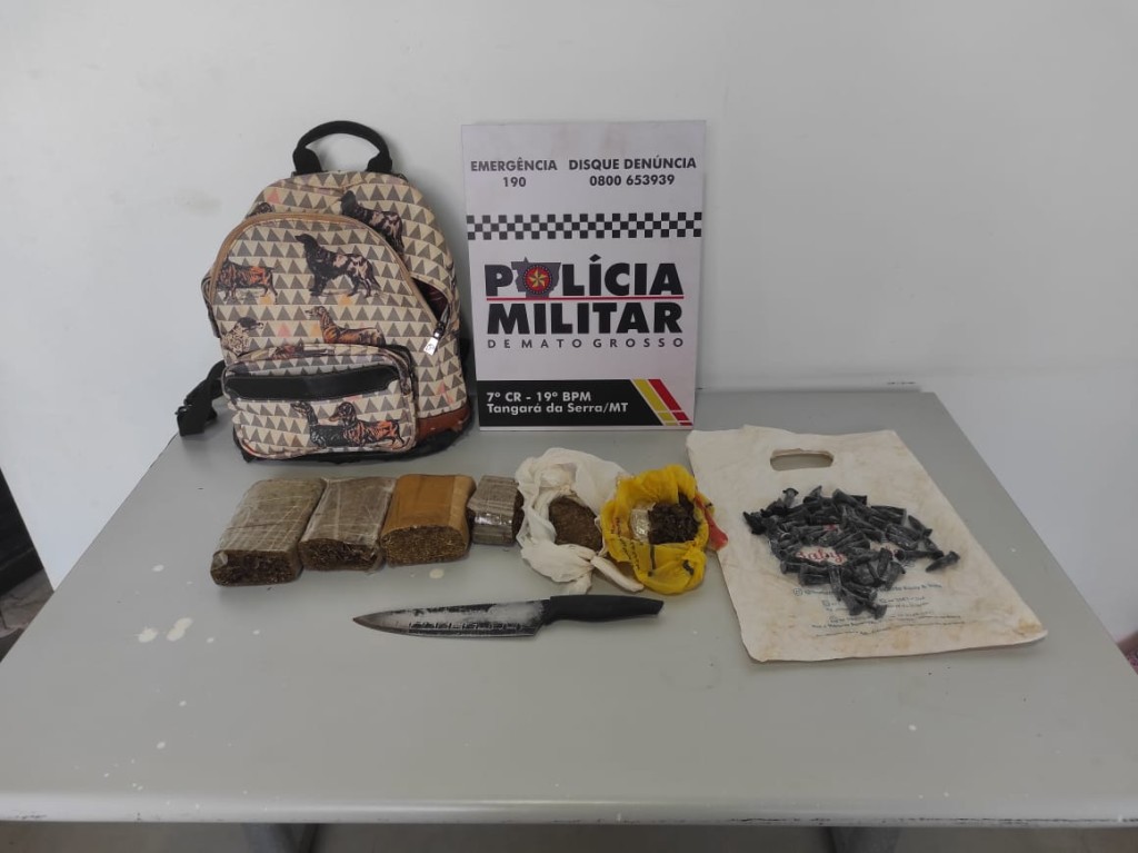 Uma mulher de 25 anos foi presa em flagrante pela Polícia Militar por tráfico ilícito de drogas, no final da manhã desta segunda-feira (14.10), em Tangará da Serra. Com a suspeita, a PM apreendeu tabletes de substâncias análogas a maconha e pinos com cocaína.