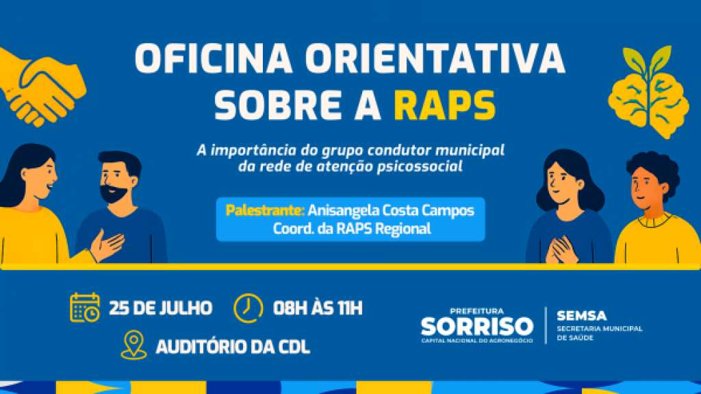 Com o objetivo de fortalecer a articulação da Rede de Atenção Psicossocial (RAPS), o município de Sorriso sediará, na próxima sexta-feira, 25 de julho, a Oficina Orientativa sobre a Importância do Grupo Condutor Municipal da RAPS. A atividade será realizada das 8h às 11h, no auditório da CDL, localizado na Rua do Bosque, nº 314 – Centro (ao lado do Fórum). O evento é voltado exclusivamente aos membros que integram o grupo condutor municipal e busca reforçar estratégias de organização, integração e efetividade da rede de saúde mental.