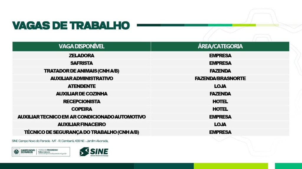 O SINE Campo Novo do Parecis está com novas vagas abertas em diversas áreas: empresa, loja, hotel e fazenda.