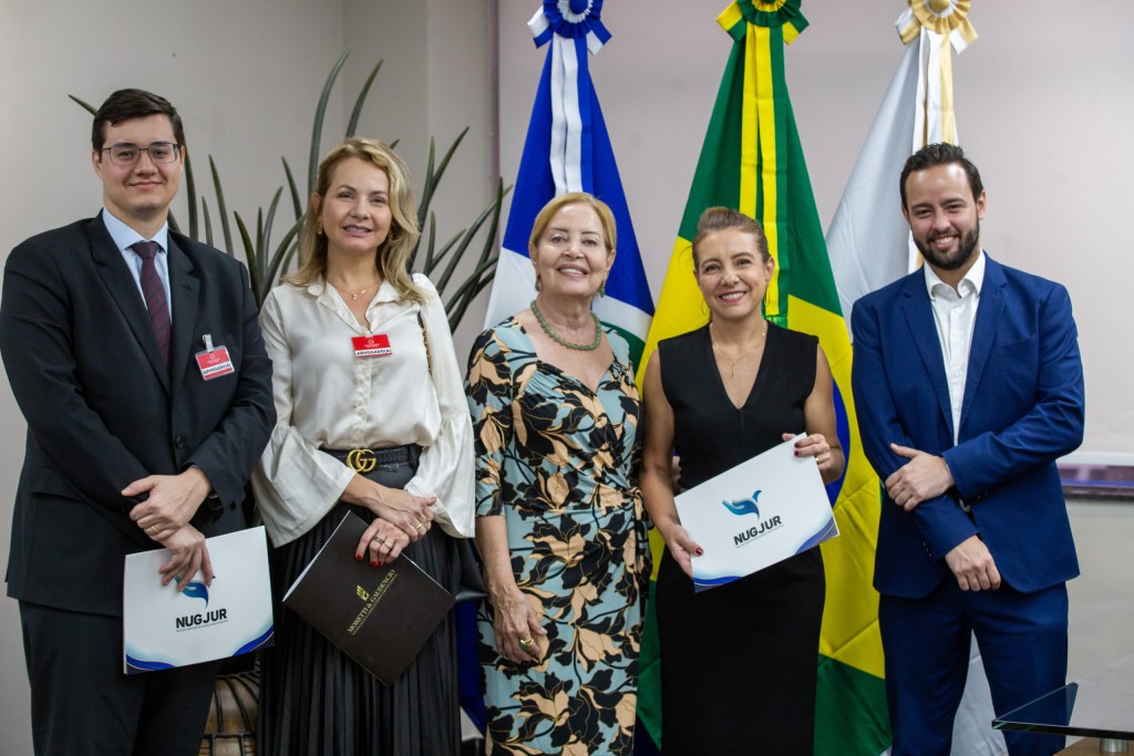 #Paratodosverem. Esta matéria possui recursos de texto alternativo para promover a inclusão das pessoas com deficiência visual. Um grupo de cinco pessoas lado a lado, sendo dois homens e três mulheres. No centro da imagem está a presidente do TJMT, que veste um vestido estampado, e a sua esquerda está Flávia Moretti, que veste um vestido preto.