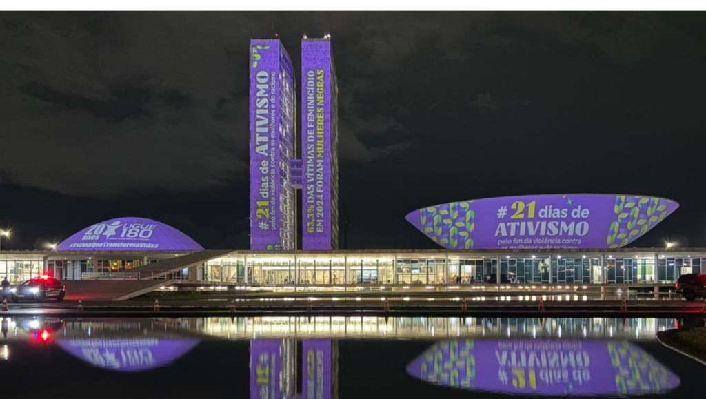 O prédio do Congresso Nacional, em Brasília, recebeu na noite desta quarta-feira (3) uma projeção especial da campanha 21 Dias de Ativismo pelo Fim da Violência contra as Mulheres e do Racismo, coordenada pelo Ministério das Mulheres. Mensagens em defesa dos direitos humanos, da igualdade racial e de uma vida livre de violências iluminaram as cúpulas do Parlamento, chamando a atenção de quem passava pela Esplanada dos Ministérios.