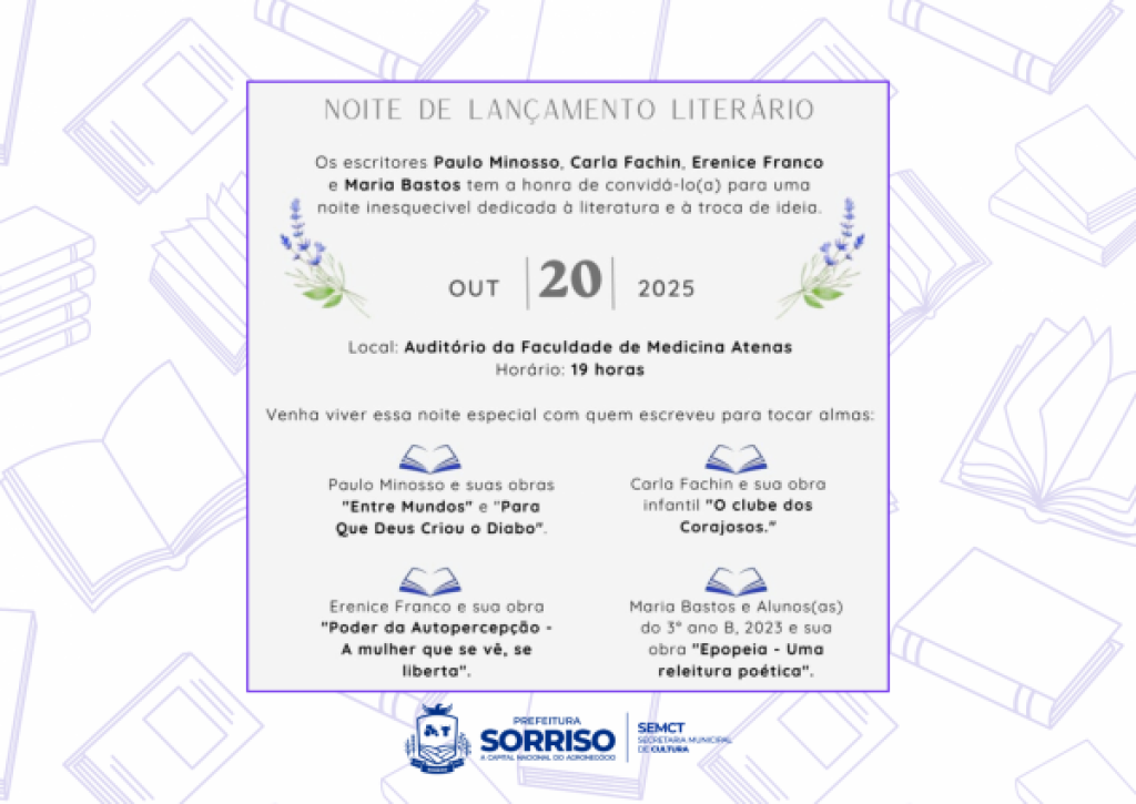 A literatura sorrisense ganha novos capítulos nesta segunda-feira (20), com o lançamento de quatro obras inéditas escritas por autores do município, em um evento que promete emoção, reflexão e valorização da produção local.