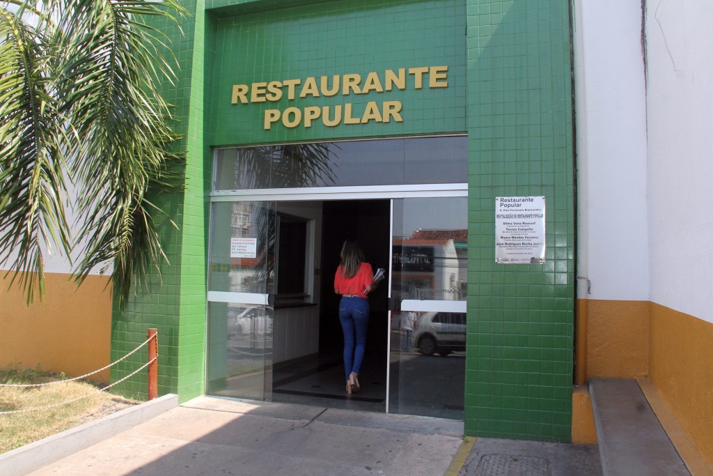 A imagem mostra a fachada do Restaurante Popular, pintada na cor verde. Na foto, uma mulher entra no estabelecimento.