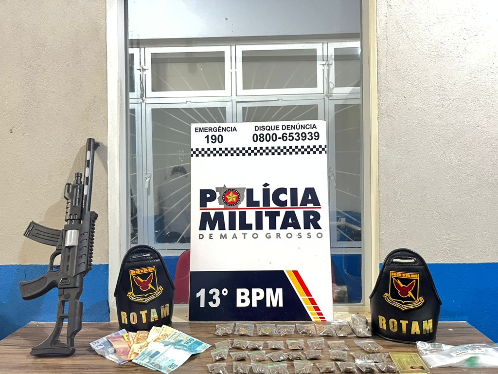 Policiais do Batalhão de Rondas Ostensivas Tático Móvel (Rotam) apreenderam, na noite desta sexta-feira (08.11), 34 porções de substância análogas à maconha e um simulacro de arma de fogo, durante abordagem no bairro Fuji, em Lucas do Rio Verde. Um homem, de 18 anos, foi preso em flagrante por tráfico de drogas.