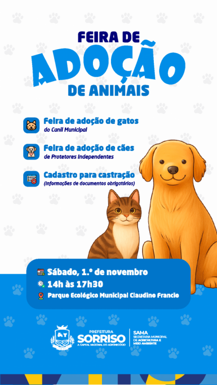 No sábado, 1.º de novembro é dia de Feira de Adoção. Na data, das 14 às 17h30, as equipes do Canil Municipal de Cães e Gatos, da Secretaria de Agricultura, Meio Ambiente (Sama), estará no Parque Ecológico Municipal juntamente com associação de protetores independentes para a realização da feira.