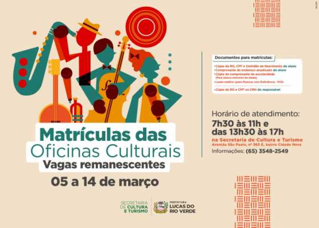 A Secretaria de Cultura e Turismo de Lucas do Rio Verde anunciou a abertura de vagas remanescentes para diversas oficinas culturais. As aulas, que são gratuitas, são organizadas conforme a faixa etária e atendem crianças, adolescentes e adultos do município.