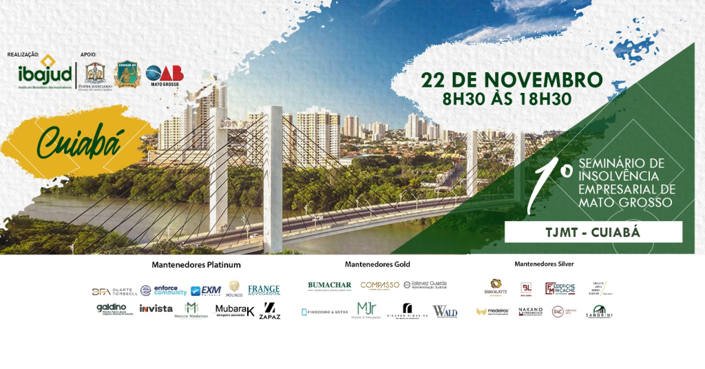 Estão abertas as inscrições para o 1º Seminário de Insolvência Empresarial de Mato Grosso, que ocorrerá no próximo dia 22 de novembro, em Cuiabá. Promovido pelo Instituto Brasileiro da Insolvência (Ibajud), em parceria com o Tribunal de Justiça de Mato Grosso (TJMT) por meio da Escola Superior da Magistratura de Mato Grosso (ESMAGIS-MT) e da Ordem dos Advogados do Brasil – Seccional Mato Grosso (OAB-MT), por meio da Escola Superior da Advocacia, o evento reunirá especialistas de renome nacional para discutir os desafios da recuperação e falência corporativa no Brasil.O encontro é direcionado a advogados, juízes, promotores, contadores, administradores judiciais, leiloeiros, bem como empresários e estudantes das áreas de Direito e Administração. As inscrições são gratuitas, as vagas limitadas e haverá certificação para os participantes.