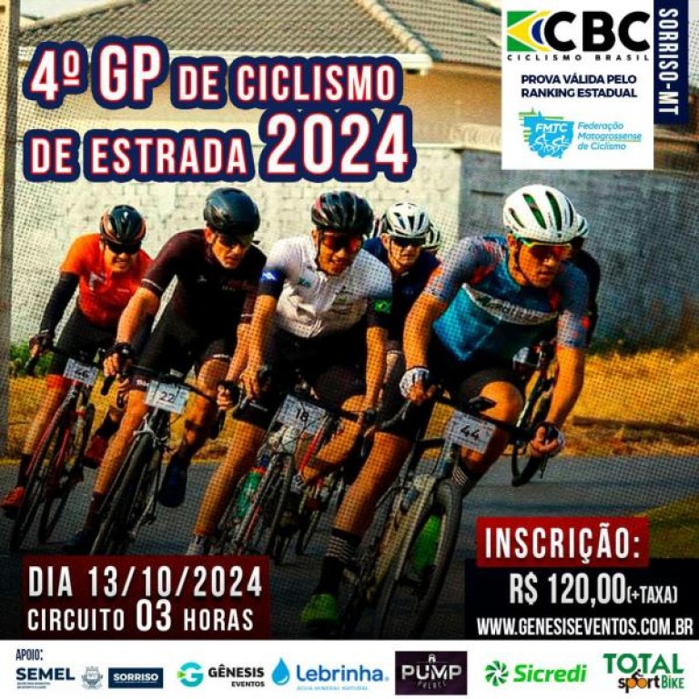 A Liga Regional de Ciclismo promove no próximo domingo (13), o 4º GP de Ciclismo de Estrada- Speed 2024. O evento promete atrair mais de 90 inscritos do masculino e do feminino, de vários municípios de Mato Grosso. Serão disputadas as categorias Júnior, Sub-30, Master A, Master B, Master C e Master D. A prova é válida pelo ranking estadual da modalidade.