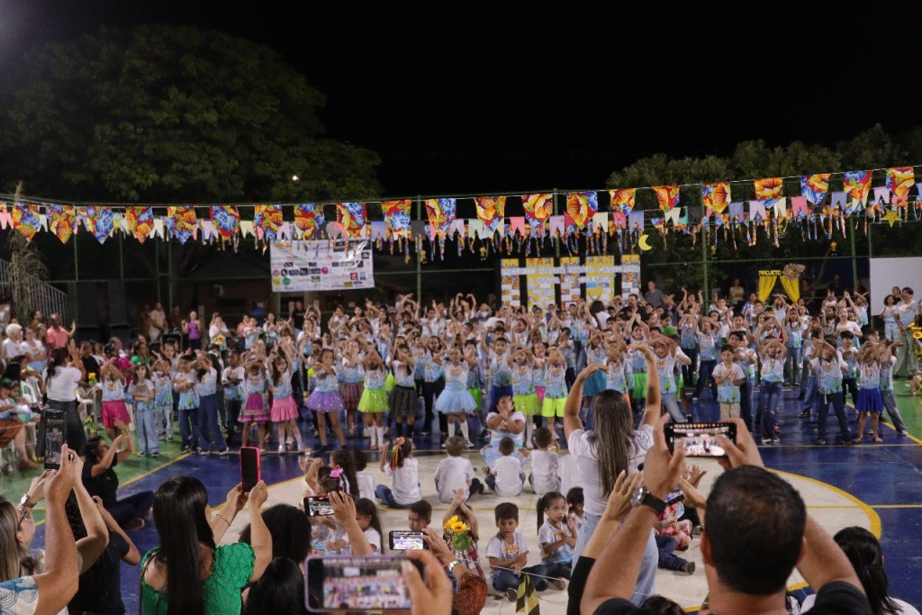Alunos da Educação Infantil ao 5º ano do Ensino Fundamental participaram com apresentações e danças, tornando a noite especial. O evento foi encerrado com uma apresentação final que reuniu todos os alunos, professores e auxiliares, reforçando a união da comunidade escolar.