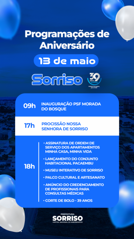 É tempo de celebrar. Celebrar Sorriso que na próxima terça-feira, 13 de maio, completa 39 anos. E para celebrar o momento o tradicional corte do bolo será realizado na terça-feira, 13 de maio, às 18 horas na Praça das Fontes.