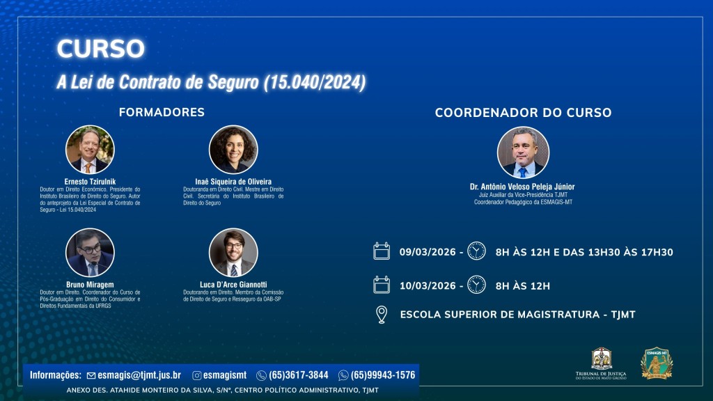 Garanta sua vaga no “Curso sobre a Lei de Contrato de Seguro – Lei 15.040/2024”. As aulas, ofertadas pela Escola Superior da Magistratura de Mato Grosso (Esmagis-MT), ocorrerão em 9 de março, das 8h às 12h e das 13h30 às 17h30, e em 10 de março, das 8h às 12h, na sede da escola, em Cuiabá.