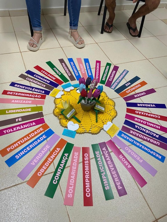 #Paratodosverem – Esta matéria possui recursos de texto alternativo para promover a inclusão das pessoas com deficiência visual. Foto 1: a imagem mostra o Círculo de Construção de Paz, que consiste em palavras de carinho e solidariedade impressas em papéis colorido dispostos em círculo. No centro do círculo está um guardanapo de crochê na cor amarela vibrante com um vaso com flores de tecido em cima. Os participantes sentam-se em cadeiras ao redor deste círculo. Na imagem pode-se ver os pés de dois deles. Foto 2: a imagem mostra o psicólogo, o juiz e a assistente social da Comarca em pé, olhando para a câmera e sorrindo. O Círculo de Paz aparece no chão à frente deles. Na sala estão cadeiras azuis em volta do círculo.